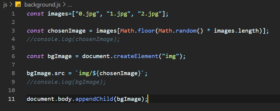 const bgImage = document.createElement("img"); : JS์์ HTML ํ๊ทธ ๋ง๋ค ์ ์๋ค.